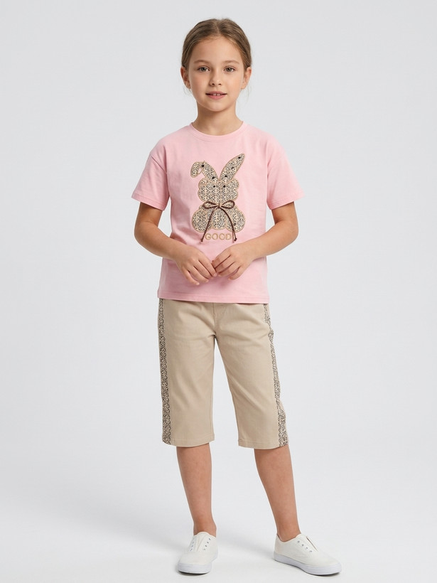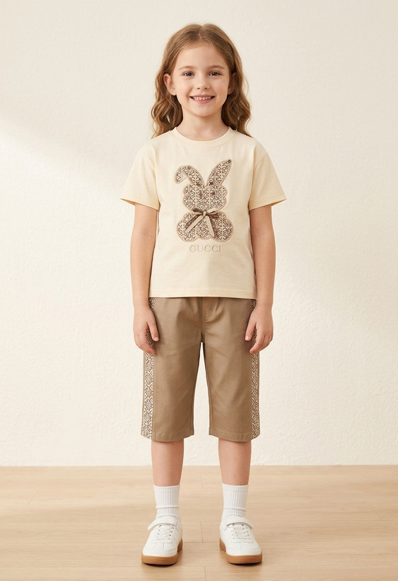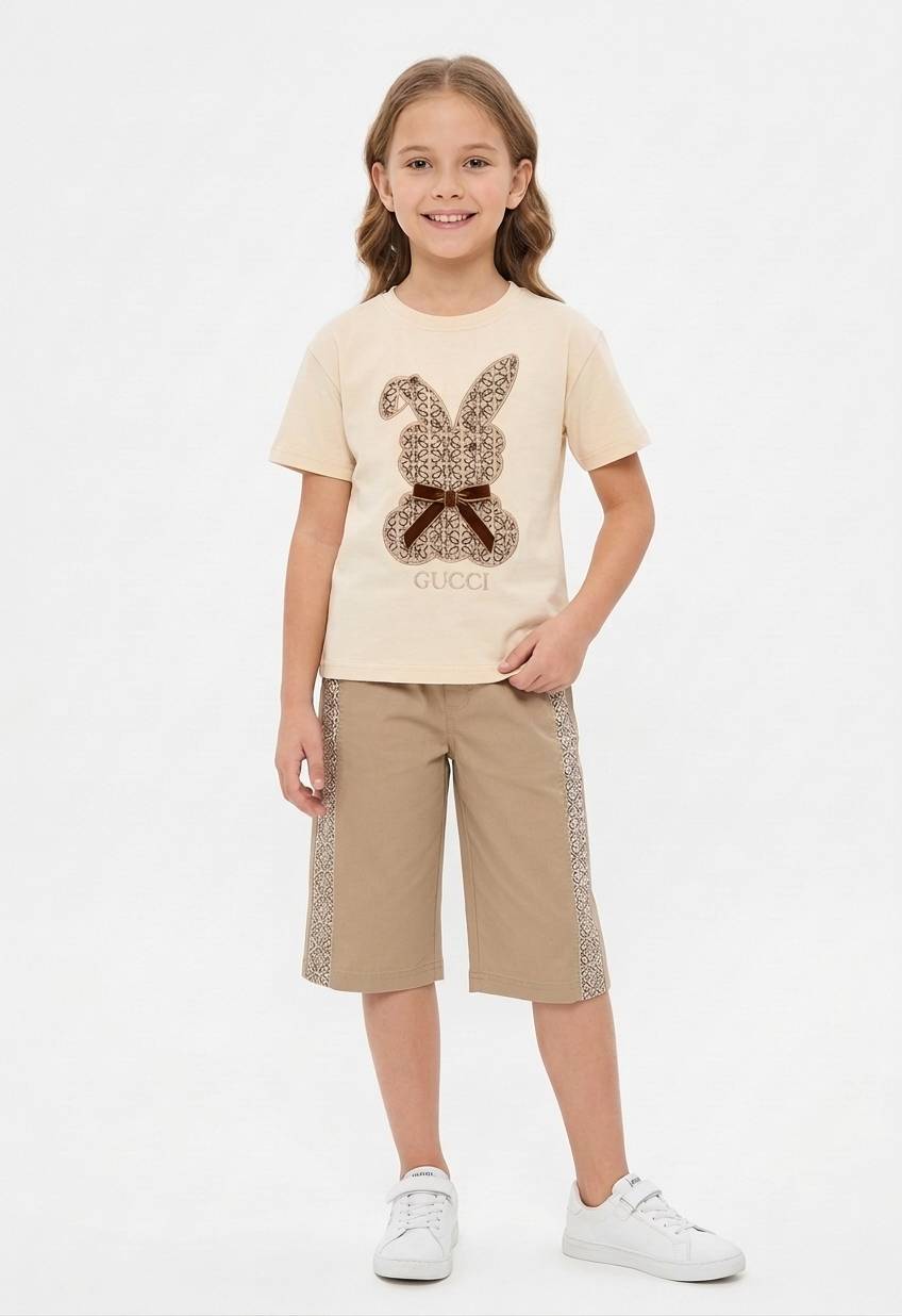 تیشرت شلوارک طرح گوچی جنس تیشرت پنبه یه رو هستش و قواره لش جلو لباس خرگوش دوخته شده از جنس کتون هست و روی خرگوش مروارید دوخته شده برای زیبایی جنس شلوارک کتان مناسب فصل هستش شلوارک ها بلند هست و تا زیر زانو اندازه میشه دو تا جیب داره و کنار شلوارک هم تیکه دوزی طرح گوچی هست سوالی داشتین با شماره
