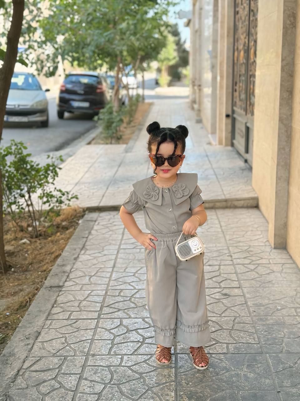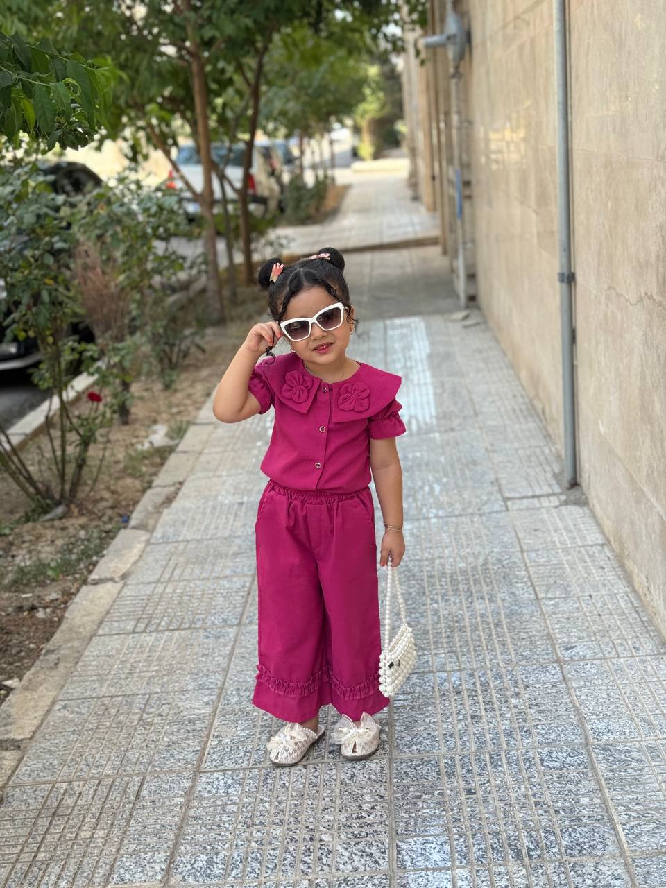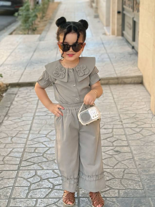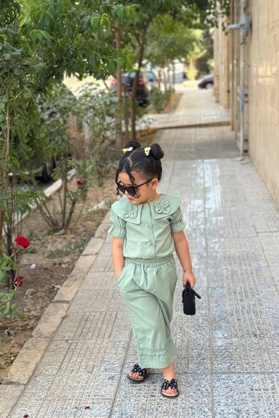 جلو لباس دکمه میخوره و آستین لباس پفی هست ست با یه شلوار بگ که چین های بسیار زیبا دمپا کار شده و دوخته شده کمر شلوار کش هستش و بسیار راحت برای بچه ها