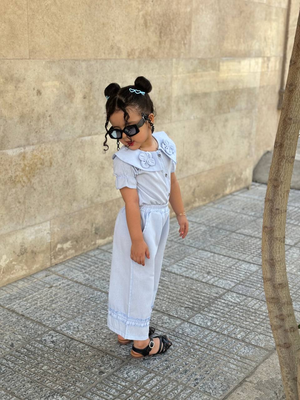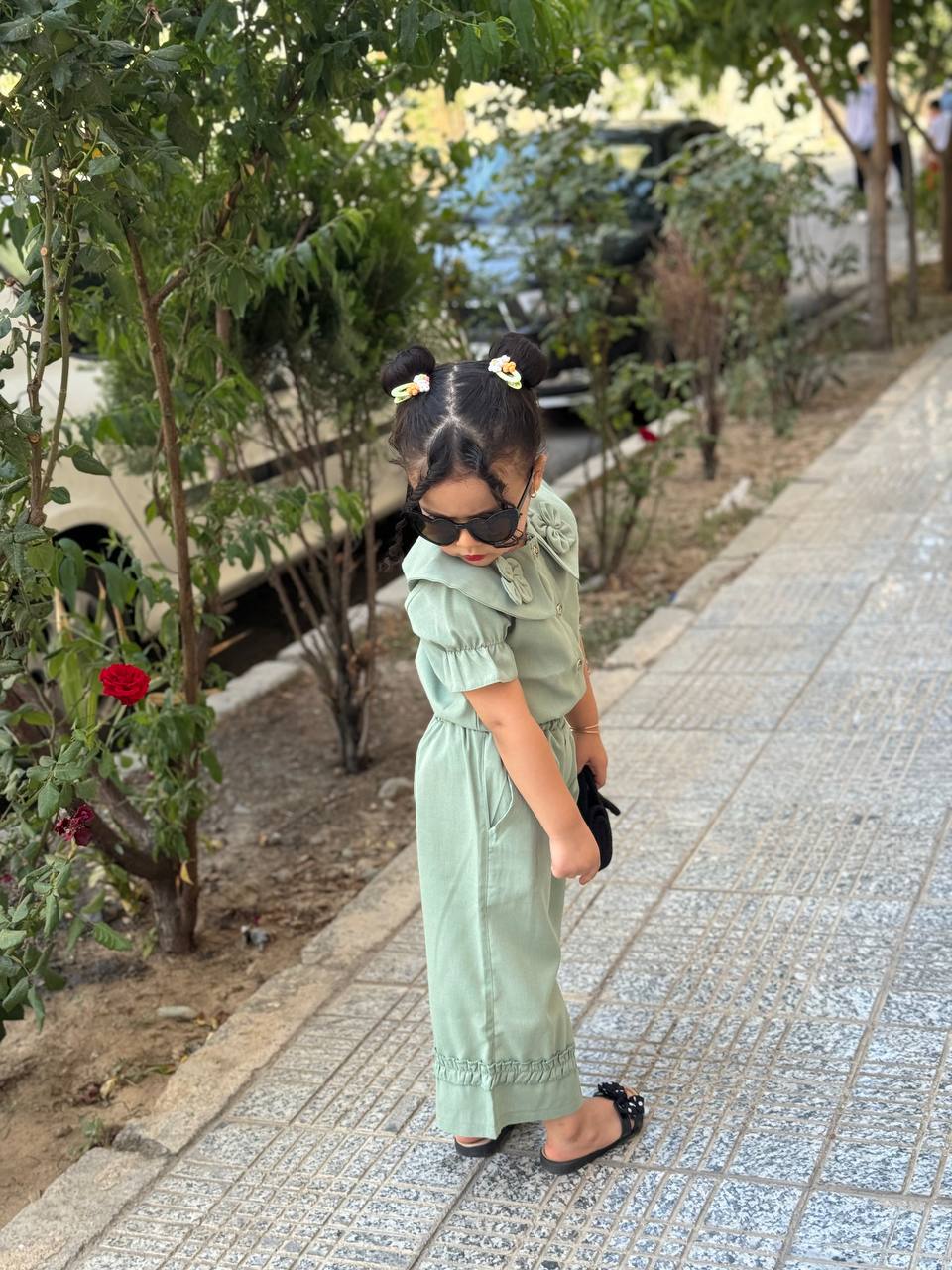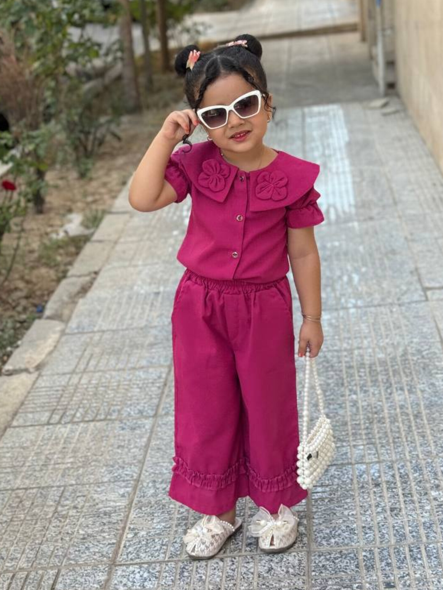 جلو لباس دکمه میخوره و آستین لباس پفی هست ست با یه شلوار بگ که چین های بسیار زیبا دمپا کار شده و دوخته شده کمر شلوار کش هستش و بسیار راحت برای بچه ها